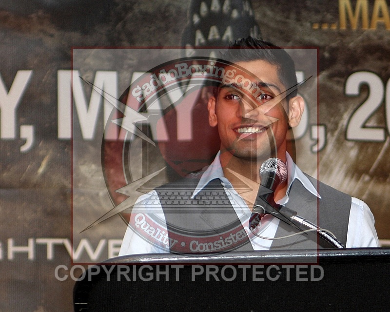 Description: May 12, 2010 New York, NY, USA WBA Super Lightweight Champion Amir Khan speaks to the media at a press conference at the Theater Lobby of Madison Square Garden . Khan will defend his title against Paulie Malignaggi in the ring on Saturday, May 15, 2010 at Madison Square Garden, New York, NY. Khan - Malignaggi Press Conference
